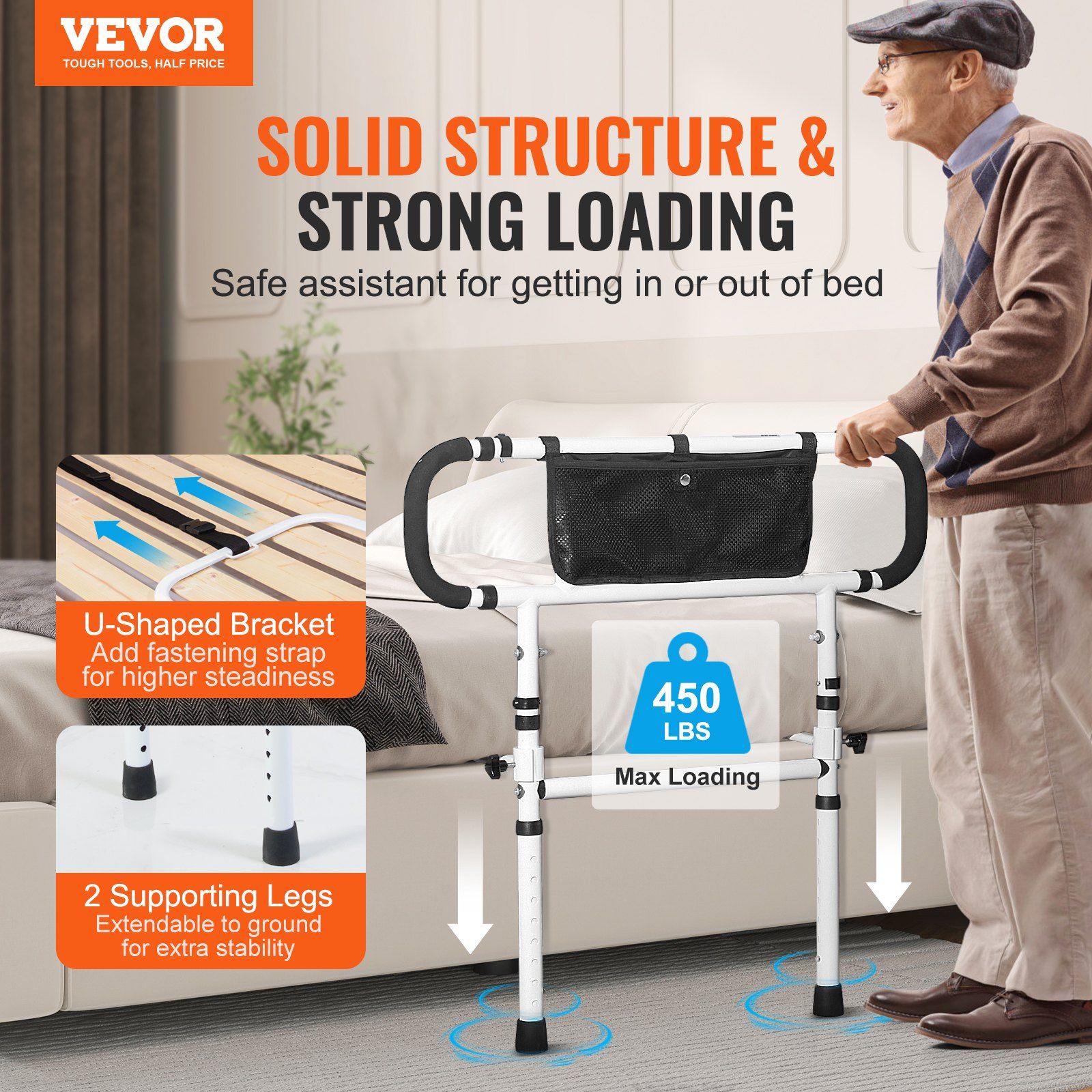 1.Safety Reinforced: VEVOR's bed rails for elderly adults, boast a robust carbon steel structure. Accompanied by two supporting legs, a U-shaped bracket, and secure fastening strap, it supports up to 450lbs. This is an essential aid for seniors, expectant mothers, and those with mobility challenges.