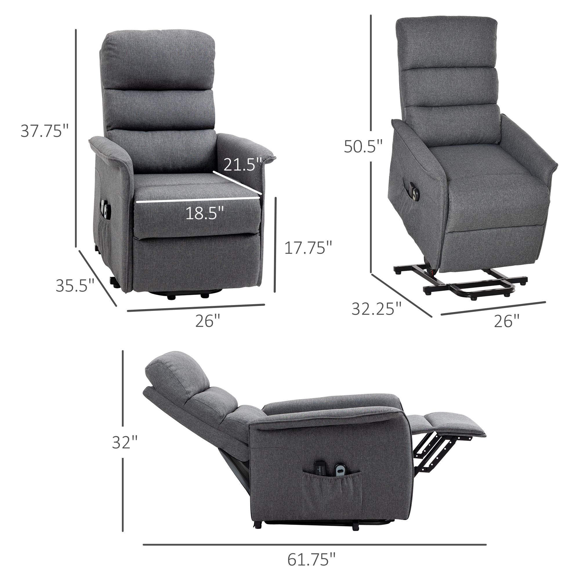 5.- Power Lift Chair Information: Overall Dimensions: 35.5" D x 26" W x 38.75" H, Reclining Dimension: 61.75" L x 26" W x 32" H..